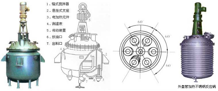 反應(yīng)鍋由鍋體、鍋蓋、攪拌器、電加熱油夾套、支承及傳動(dòng)裝置、軸封裝置、溢油槽等組成,并配有電加熱棒及測溫、測壓儀表。(見圖1、2)由于用戶因生產(chǎn)工藝、操作條件不盡相同,攪拌型式一般有錨式、漿式、渦輪式、推進(jìn)式或框式。交承座有懸掛式或支承式二種。套內(nèi)置熱介質(zhì)汽缸油,由電熱棒加熱,夾套上開有進(jìn)、排油、溢油、放空及電熱棒、測溫等接管孔。夾套外壁焊接支座,鍋體下部開有放料口。