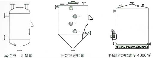 計量罐、高位槽、貯罐制作,按裝尺寸參見化工工藝設(shè)計手冊第三章中(JB1420-74~JB1428-74)。特殊規(guī)格另行設(shè)計制造。